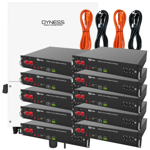 Мрієте про повну енергетичну автономність та надійне резервне живлення для вашого дому чи бізнесу? Цей комплект – ваш квиток у світ безмежних можливостей! Він поєднує в собі потужний гібридний інвертор Dyness 8.0L-1P-A та десять надійних літій-залізо-фосфатних акумуляторів Dyness B4850G, а також необхідні кабелі для підключення. Разом вони створюють досконалу систему енергопостачання, забезпечуючи вражаючу ємність, ефективне використання сонячної енергії та інтелектуальне управління.